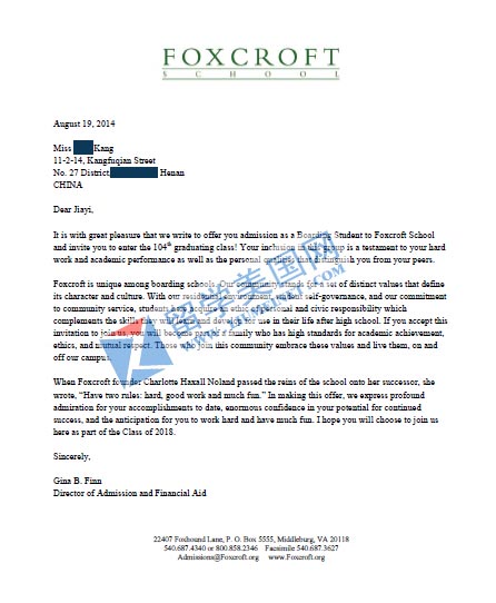 恭喜康同学获寄宿高中Foxcroft School录取!Foxcroft School是美国弗吉尼亚州非常棒的寄宿高中!8月中旬,学校唯一的最后一个名额,被留学美国网的学生获得!