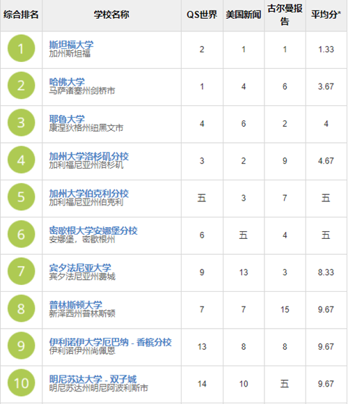 美国留学选校或者选择专业,最直接的依据都是排名,但是单一排名总有不足之处。为了更好的服务大家,今天留学美国网分享了一个综合了USNews和QS,古尔曼报告这3项排名的一份排名,一起来看一下吧。
