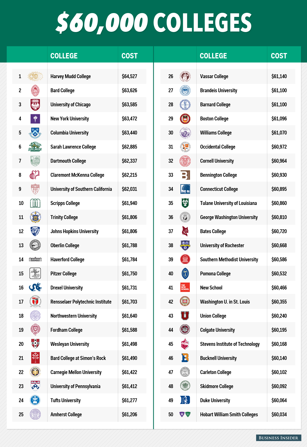 美国Business Insider 7月13日消息, 去年收费超过6万美元的大学仅有9所,最高的纽约大学收费为$61,977.今年至少50所美国大学的收费超过6万美元,最高的为$64,527
