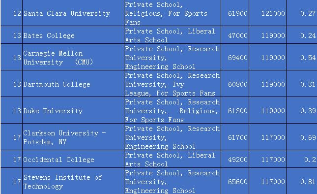 Harvey Mudd College(第3) 、USNA(第7) 、Washington and Lee University(第30)、Colgate University(第24)、Carleton College(第69) 都盛产高薪资的毕业生。有潜力的学生需要认识到读文理学院可能意味着在你的梦想职业中站稳脚跟需要多花一点时间,但是他们全面的综合教育、通识技能以及清楚的沟通能力能为你的成功职业生涯做好充分准备。
