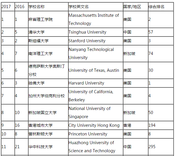 从近两年排名中对比分析可以看出,麻省理工学院连续两年位列第一名,在工科的实力上一致处于世界领先水平。本次清华大学也是非常出色,位列第二名,较16年上升3名,斯坦福大学下降已经位列第三。