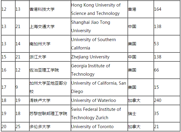 加拿大大学入围3所,滑铁卢大学位列第18名,多伦多大学与其相近位列20。