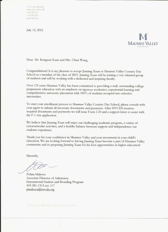 Maumee Valley Country Day School 录取通知书