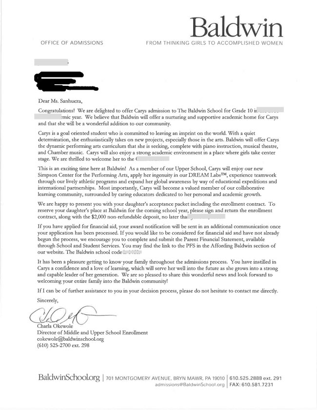 恭喜留学美国网L同学成功拿到了鲍德温女校的offer,L同学其实是很独立的女孩子,对学校又非常的有自己的主见,自己申请了一些寄宿学校,无奈全部落空,所以她找到我们的时候已经非常晚了,大部分学校已经关闭申请,好学校的名额更是极其有限。