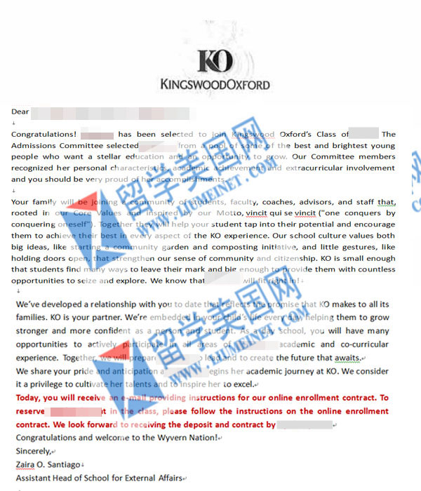 恭喜留学美国网W同学成功拿到了金斯伍德学校的offer,祝W同学在美国学习顺利健康成长。