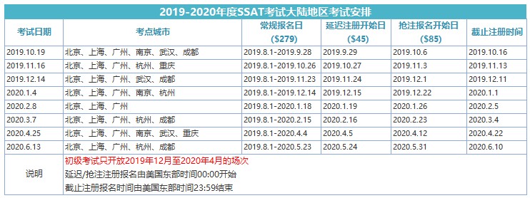 ssat考点及考试时间(2019-2020)
