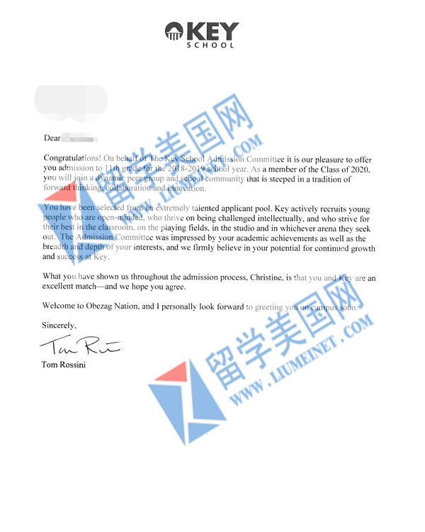 恭喜CRS同学获得 The Key School 录取offer~在这里祝C同学在美国学业有成!展翅高飞!~~美国高中申请火爆进行中,部分学校还有名额,详情咨询:400-000-7805,微信:liumeinet2014