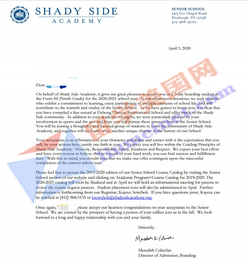 留美网刘同学被桑迪赛德学院录取(Shady Side Academy)