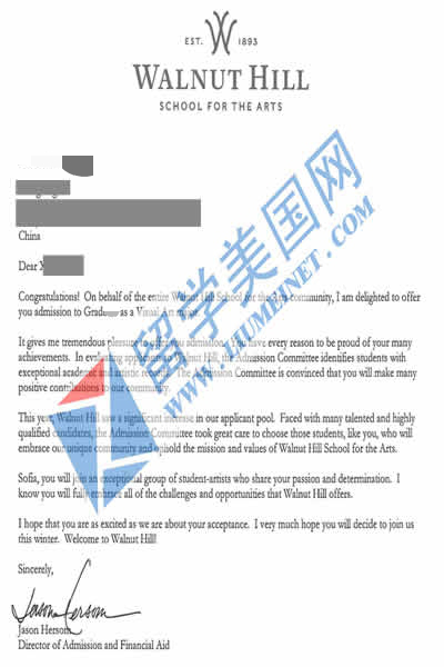 留美网Z同学被胡桃山艺术高中学校Walnut Hill School录取offer展示
