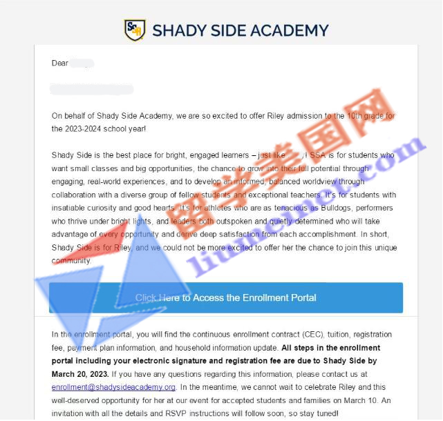 录取喜报,恭喜留美网L同学斩获桑迪赛德学院Shady Side Academy录取~