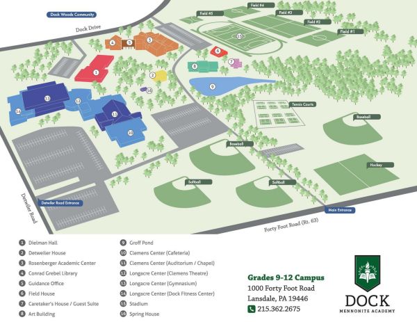 Dock Mennonite占地75英亩的校园建筑和景观设计得像一所大学,分为距离5英里的两个校区,两校区资源共享,其中高中校区占地40英亩。高中校区设施一流,现代化的教学设备:科学实验室、计算机实验室、化学教室、电子白板教学、1:1iPad教学、图书馆、表演厅、实验室、健身房、运动场、音乐室、舞蹈练习室食堂、体育馆、艺术厅、大礼堂、运动场等等一应俱全;还有各种最先进的视频录制编辑设备。满足学生户内、户外学习与运动的所有需求。