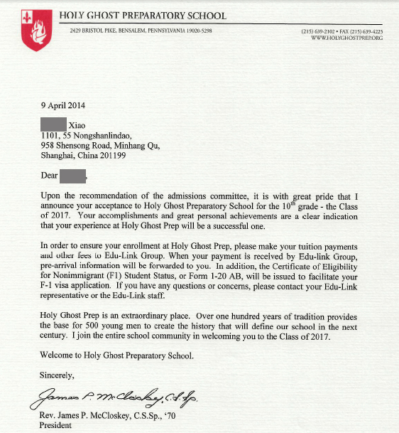 在4月份还可以争取到一所东部顶尖高中的名额,我想不是任何机构可以做到的,但是留学美国网做到了,肖同学无任何语言成绩,我们为他争取了费城TOP10顶尖高中圣灵中学的面试机会,总监亲自带学生参加了学校的面试,最终获得了学校的亲赖!