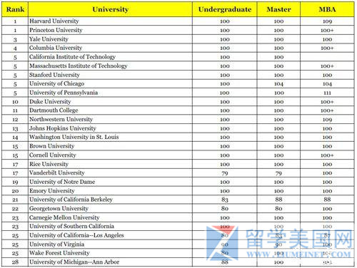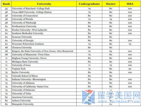 美国前100名大学需要的托福成绩