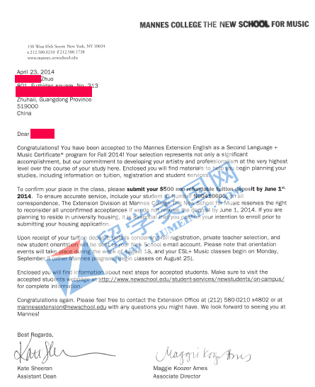 卓同学参加了音乐学校联盟在广州的面试,他的表现给面试老师留下了深刻的印象。他申请了当时音乐学校联盟里所有的学校。不过那些学校全部要TOEFL,有的还要SAT。当时时间紧迫,来不及准备SAT,所以我们排除了要SAT的学校,又补申了音乐学校联盟之外的学校。