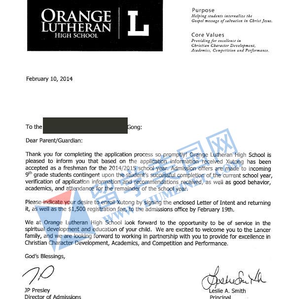 最终,学生选择了加州橘郡最好的高中:橘郡路德高中!下面是录取信。