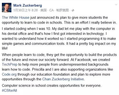 而Facebook和苹果等高科技公司也先后公开发表承诺,将全力支持政府政策,推动计算机科学教育的发展。Facebook的CEO扎克伯格在Facebook上公开表示“学校的计算机科学教育正在为每位学生创造机会”,并提出将通过TechPrep等新功能确保对计算机科学教育的支持。而苹果则公开声明,将通过投资计算机课程和培训班等方式为学生提供编程学习的机会。