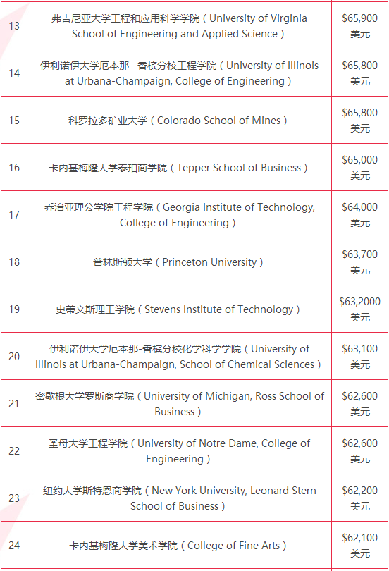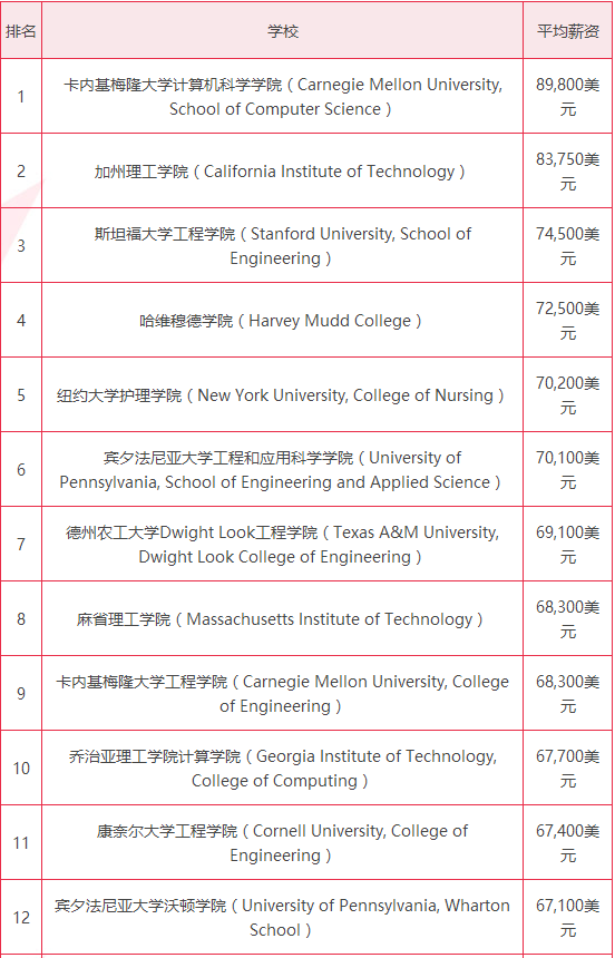 实际上,目前的很多学校,比如卡内基梅隆,对大学内各学院毕业生的薪资水平进行了细化,包括计算机科学学院、工程学院(起薪68,300美元)和商学院(起薪65,000美元)。毫不奇怪的是,收入最高的毕业生中大部分都拥有这些学科的学位。但其他学校,比如普林斯顿大学(排名第18位,起薪63,700美元),以及莱斯大学(排名第36位,起薪60,000美元)报告的则是毕业生的整体薪资水平,其中包括文科、美术和社会科学专业。对于大众认为美术专业会在求职市场上遇冷,但卡内基梅隆大学美术学院的毕业生却表现亮眼,平均起薪62,100美元,在榜单上排名第24位。卡内基梅隆大学的人文学院——特里希人文和社会科学学(Dietrich College of Humanities & Social Sciences)——也很吃香,它的毕业生平均起薪60,700美元,排名第32位。
