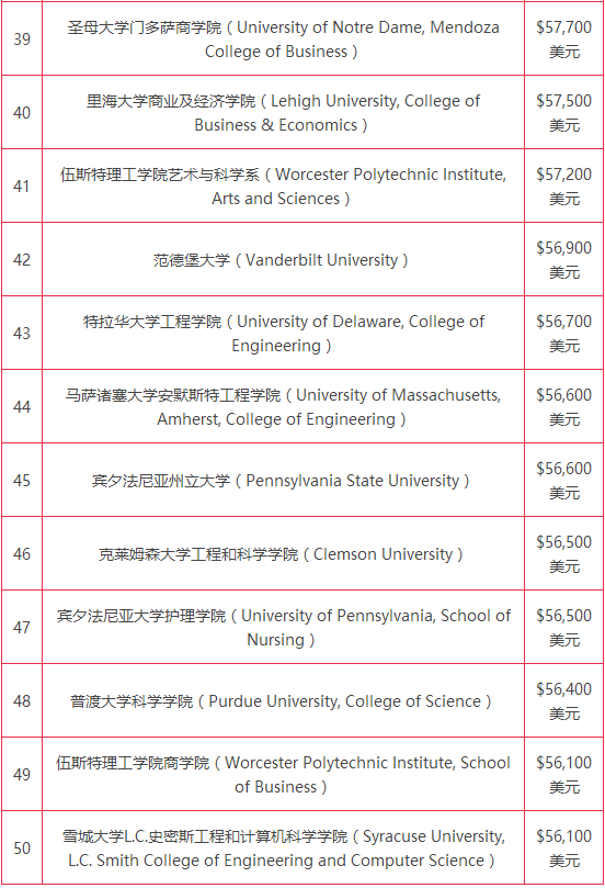 为汇总毕业生薪资排行榜,留美网首先从《美国新闻与世界报道》(US News & World Report)顶级大学排行榜的前100所全国性大学以及前30所文理学院入手,并与它从高校求职网站收集到的数据进行参照,这些网站对学生薪资水平进行调查。并追踪了2014、2015和2016届毕业生的起薪,算出每所院校的平均值。这份榜单远谈不上全面,因为有很多学校,比如哈佛大学、耶鲁大学和布朗大学,都不发布毕业生薪资信息,因此这些学校都不在榜单上。美国有超过4,500所能够授予学位的大专院校,NerdScholar只调查了其中的一小部分。但还是觉得这些数字能够说明一些问题,因为它们是一些确切的数字,显示了美国一些顶级大学新毕业生的薪资水平。从而得到了57所大学中184个学院的数据。