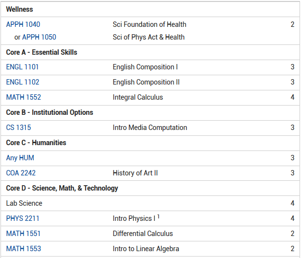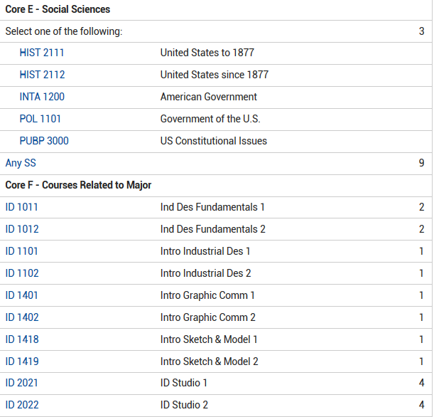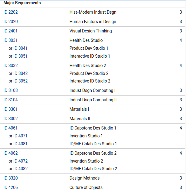 所有需要的工业设计课程必须用C或更高的一个档次完成。只有满足这个要求才能进入更高级的工业设计工作室继续学业,无法满足该条件的学生可能会被要求延长一年的学业。工作室设计的课程只对应秋季的时间表。最多9学分可作为学生合格还是不合格的依据。