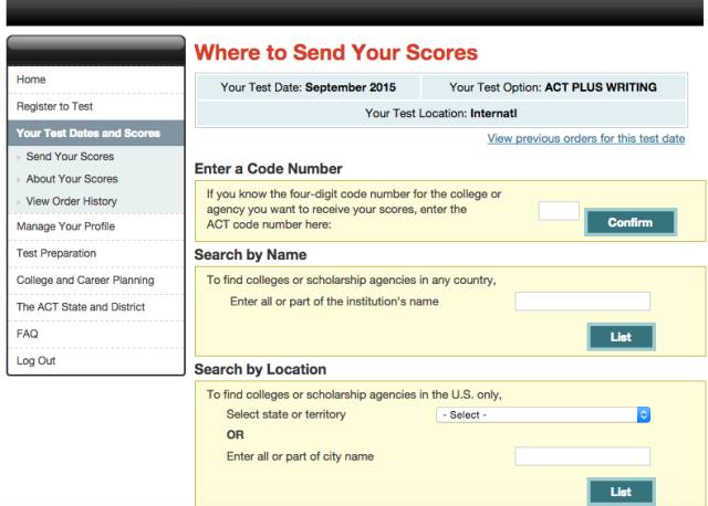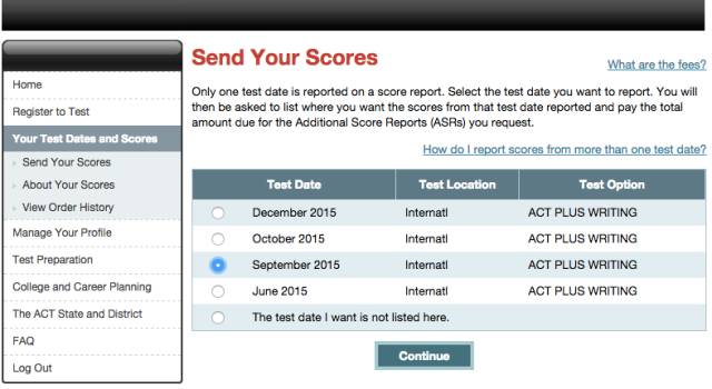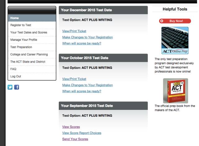 进入后出现你的待考的和已经出分的ACT成绩,对于已经出分的成绩就有send your scores这一选项,点击进入。