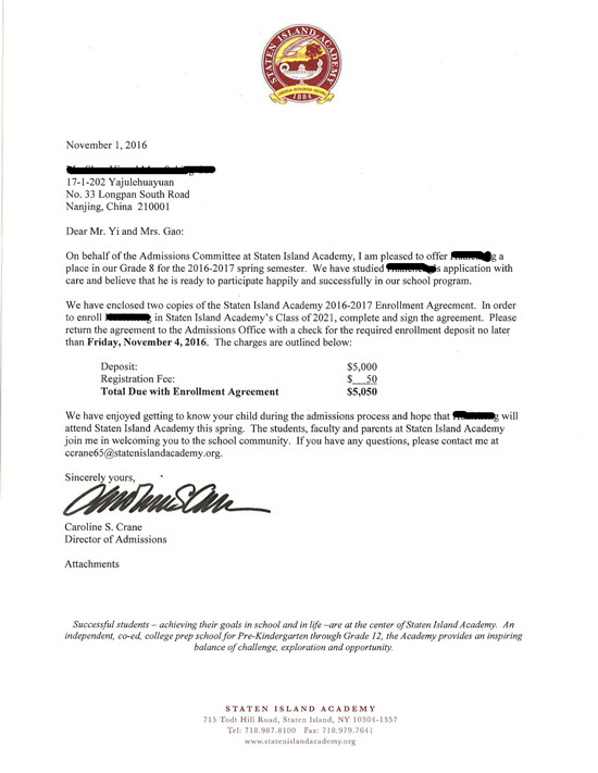 恭喜易同学被斯泰顿岛中学录取