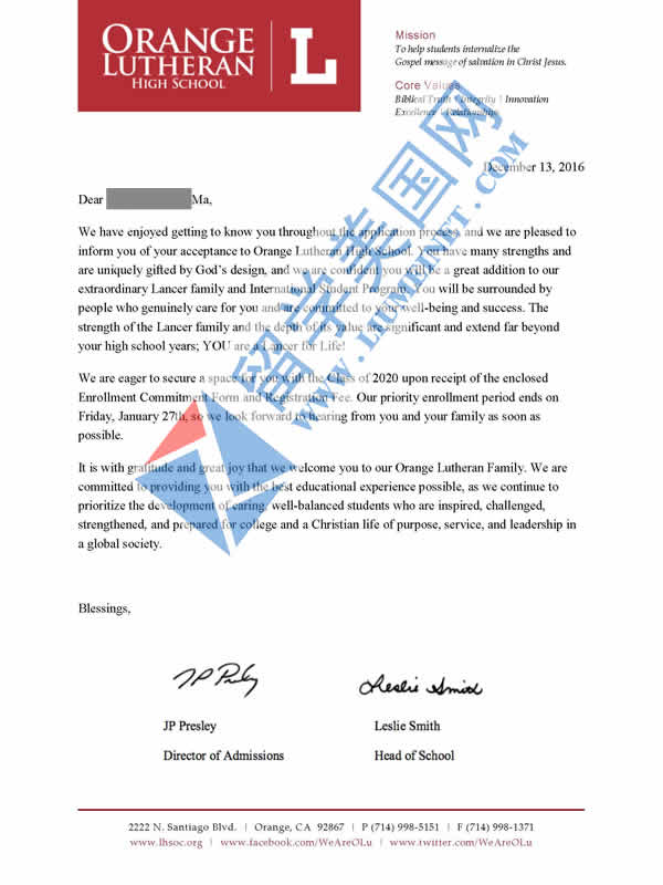 恭喜马同学获得Orange Lutheran High School橘郡路德高中offer录取