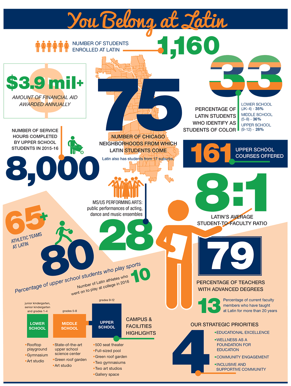 4、教师:40%的教师在芝加哥拉丁中学工作10年以上,87%的教师拥有硕士或博士学位。教师对所教的学科领域充满热情,可以帮助学生上下课。