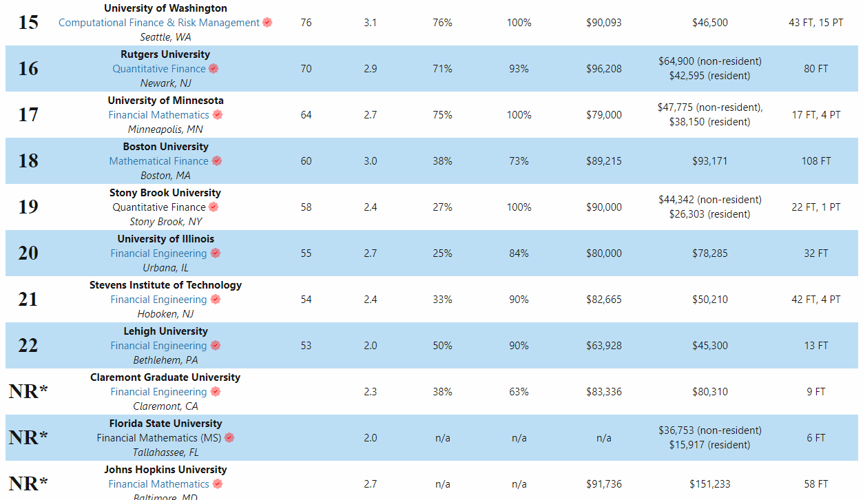 2022年金融工程硕士排名: